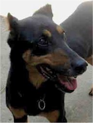 about 7 years old; she is black and rust, cropped, docked, and spayed.