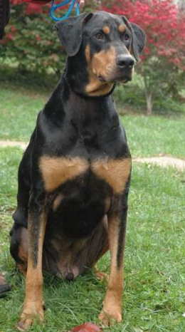 is 7 years old, black/tan, with natural ears and a docked tail.