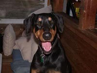 blossomed. Mitzie is approximately 9 years old, black and rust,